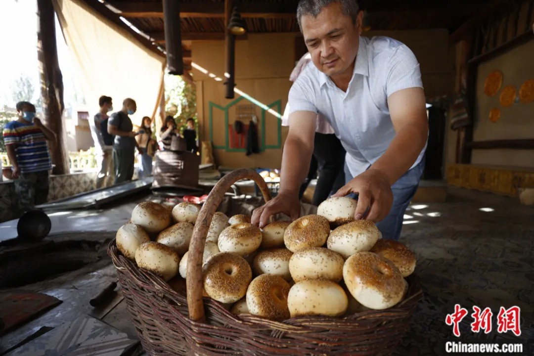 2021年9月25日,新疆維吾爾自治區(qū)克孜勒蘇柯?tīng)柨俗巫灾沃莅D什市阿孜汗村馕合作社。近年來(lái),新疆大力發(fā)展馕產(chǎn)業(yè),并逐漸成為富民增收的“名片產(chǎn)業(yè)”。中新社記者 富田 攝
