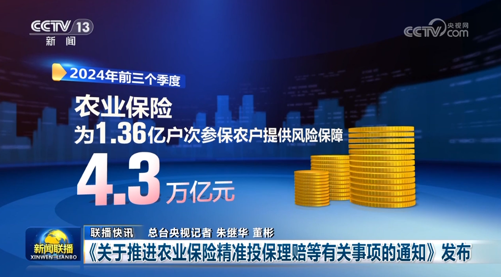 金融監(jiān)管總局等四部門近日聯(lián)合發(fā)布通知,對農(nóng)業(yè)保險投保理賠、應收保費、條款費率、數(shù)據(jù)共享等提出要求,進一步提高投保理賠精準性,推動我國農(nóng)業(yè)保險高質(zhì)量發(fā)展。今年前三個季度,農(nóng)業(yè)保險為1.36億戶次參保農(nóng)戶提供風險保障4.3萬億元。
