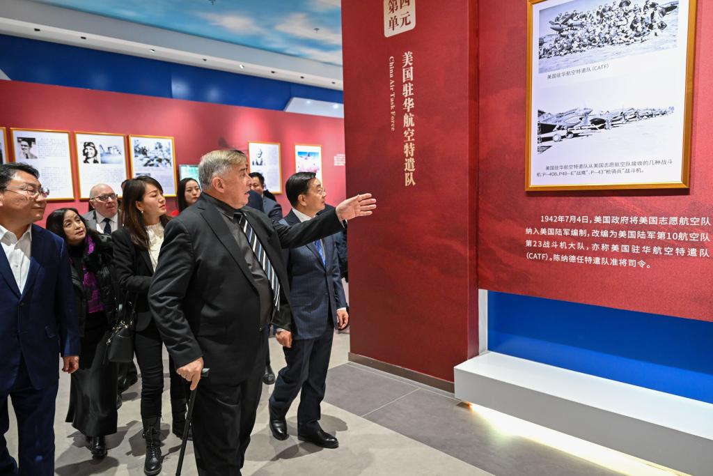 11月30日,美中航空遺產(chǎn)基金會代表團(tuán)成員在烏魯木齊文化中心展覽館觀看“銘記英雄——飛虎隊主題歷史圖片展巡展(新疆)”。新華社記者 丁磊 攝
