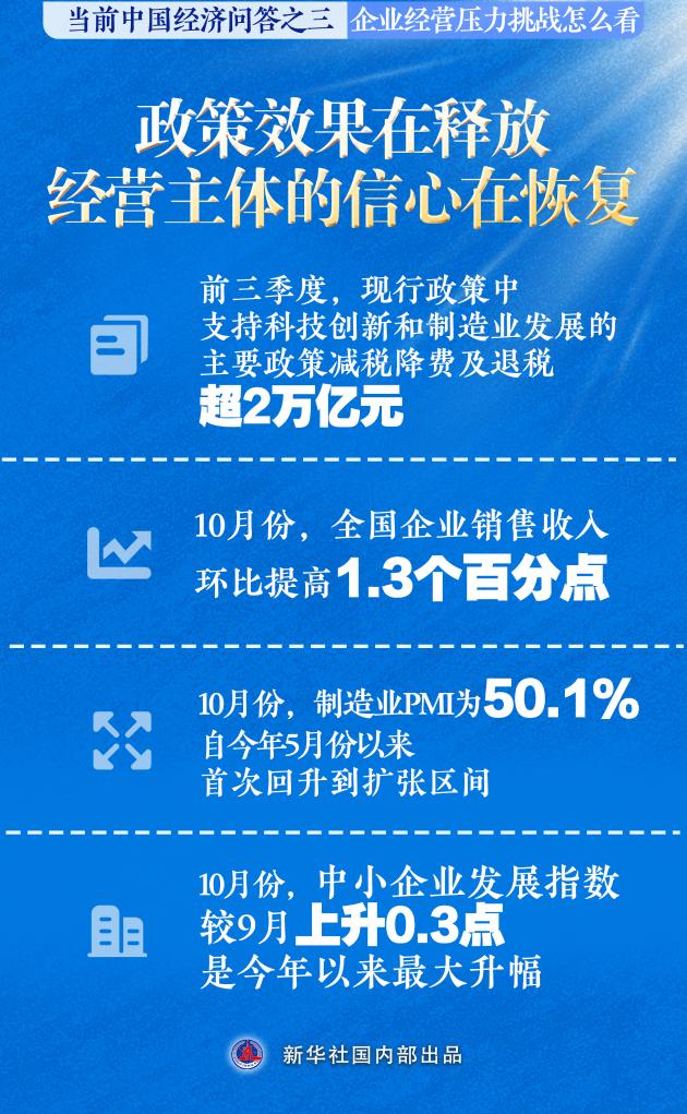 10月份,全國企業(yè)銷售收入同比增長,環(huán)比提高1.3個百分點;制造業(yè)PMI為50.1%,自今年5月份以來首次回升到擴張區(qū)間;非制造業(yè)商務活動指數(shù)連續(xù)數(shù)月穩(wěn)定在50%左右;中小企業(yè)發(fā)展指數(shù)較9月上升0.3點,是今年以來最大升幅。