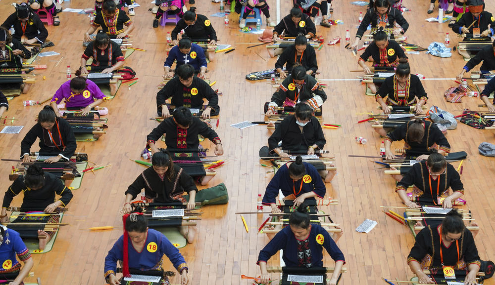 在海南省樂東黎族自治縣,選手們?cè)诩妓嚤荣惉F(xiàn)場(chǎng)編織黎錦(2023年4月23日攝)。新華社記者 樊雨晴 攝