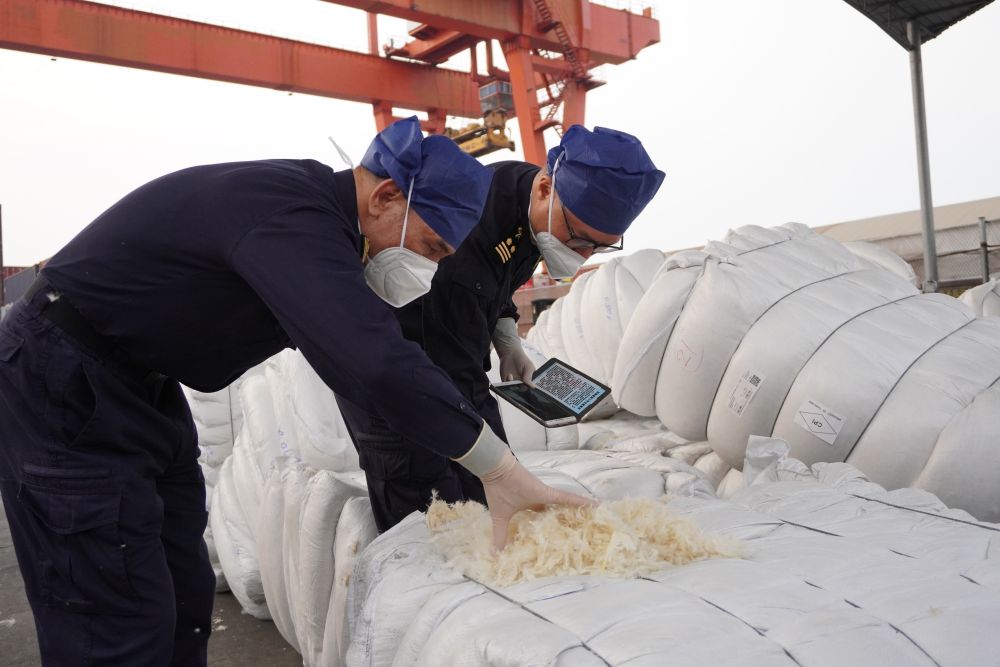 海關(guān)工作人員正在對水洗羽毛羽絨進行檢查。新華社發(fā)