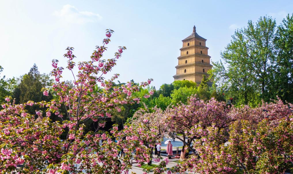 游客在西安大雁塔下游覽(無人機(jī)照片,2024年4月10日攝)。 新華社記者 鄒競(jìng)一 攝