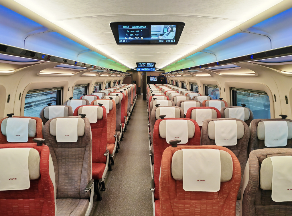 CR450AF動(dòng)車組的二等座車廂。新華社記者王聿昊 攝