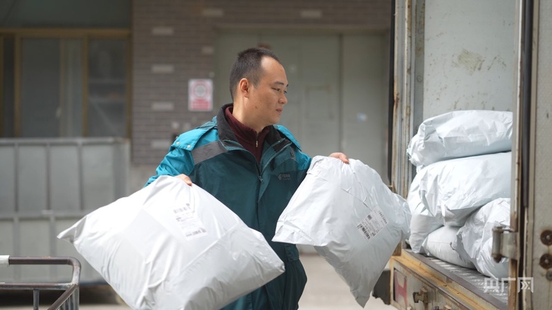 于雷正在企業(yè)廠區(qū)收取快遞件(央廣網(wǎng)記者 楊夢(mèng)奎 攝)