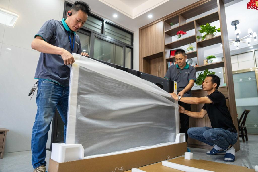 2024年9月24日,在汨羅市屈子祠鎮(zhèn)雙楚村,彭坤(右一)在家中和安裝工人一起打開新電視機的包裝。新華社記者 陳思汗 攝
