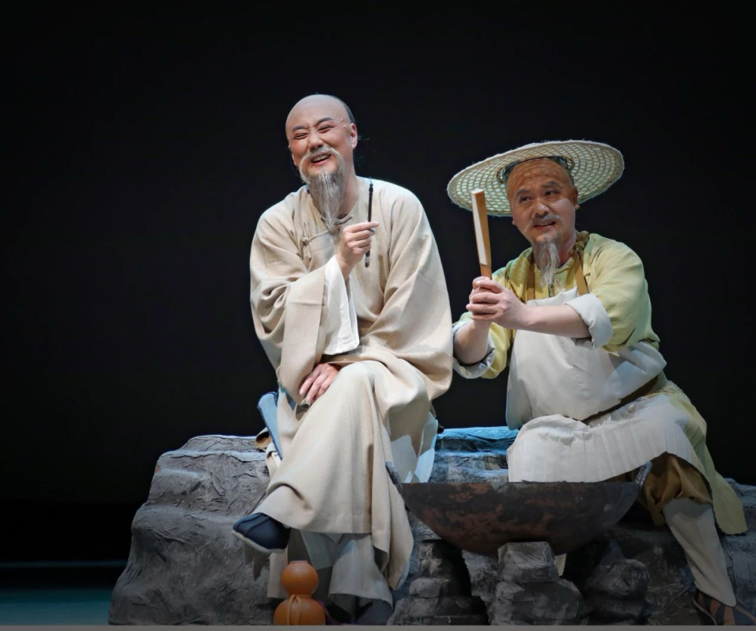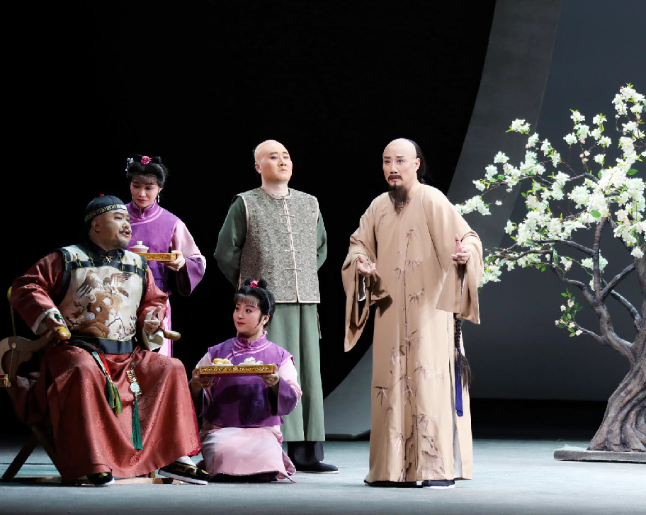 李政成的精湛表演則使創(chuàng)作完美閉環(huán)。在描繪鄭板橋繪畫(huà)菊花與蘭花的情景時(shí),他巧妙地采用了文戲武唱的手法,別具匠心地展現(xiàn)了鄭板橋的才華與骨氣。而在劇終部分,長(zhǎng)達(dá)十多分鐘、包含56個(gè)核心唱段的唱腔如波浪般層層推進(jìn),將鄭板橋一生的感悟推至觀眾心底。舞臺(tái)上的清冷視覺(jué)效果與演員熾熱的情感表達(dá)形成了鮮明的對(duì)比,在戲劇的張力中,一個(gè)有溫度、有深度、有情懷的鄭板橋仿佛從歷史中走來(lái),真正“活”了起來(lái)。