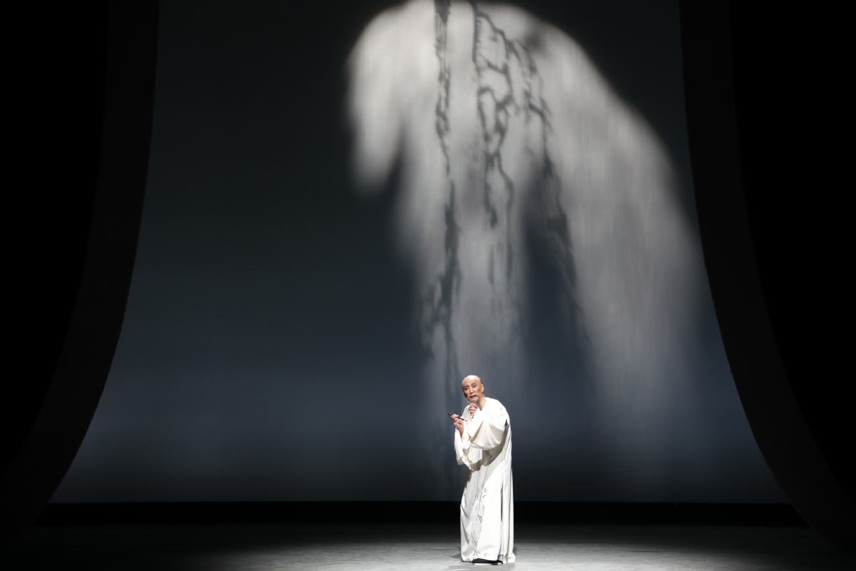 劇場(chǎng)里,舞臺(tái)的空間設(shè)計(jì)為觀眾提供深刻的審美體驗(yàn)。舞臺(tái)既保留了傳統(tǒng)戲曲“一桌二椅”的簡(jiǎn)約美學(xué),又緊扣揚(yáng)州園林特征,運(yùn)用黑白對(duì)比色調(diào)和光影變幻,隱喻鄭板橋內(nèi)心澄澈與光明,使其性格直觀生動(dòng)地傳達(dá)給觀眾,讓物理空間成為精神外延。