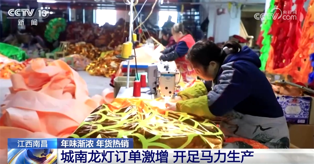 江西南昌的城南龍燈有著700多年的制作歷史。春節(jié)前,當?shù)爻悄淆垷羯a基地訂單激增。數(shù)百平方米的廠房內,設置了龍頭、龍身、龍衣、龍尾等制作區(qū),50多名工人都在有條不紊地完成自己的工序。在發(fā)貨區(qū),師傅們忙著裝貨打包,趕在年前給來自全國和海外的訂單發(fā)貨。
