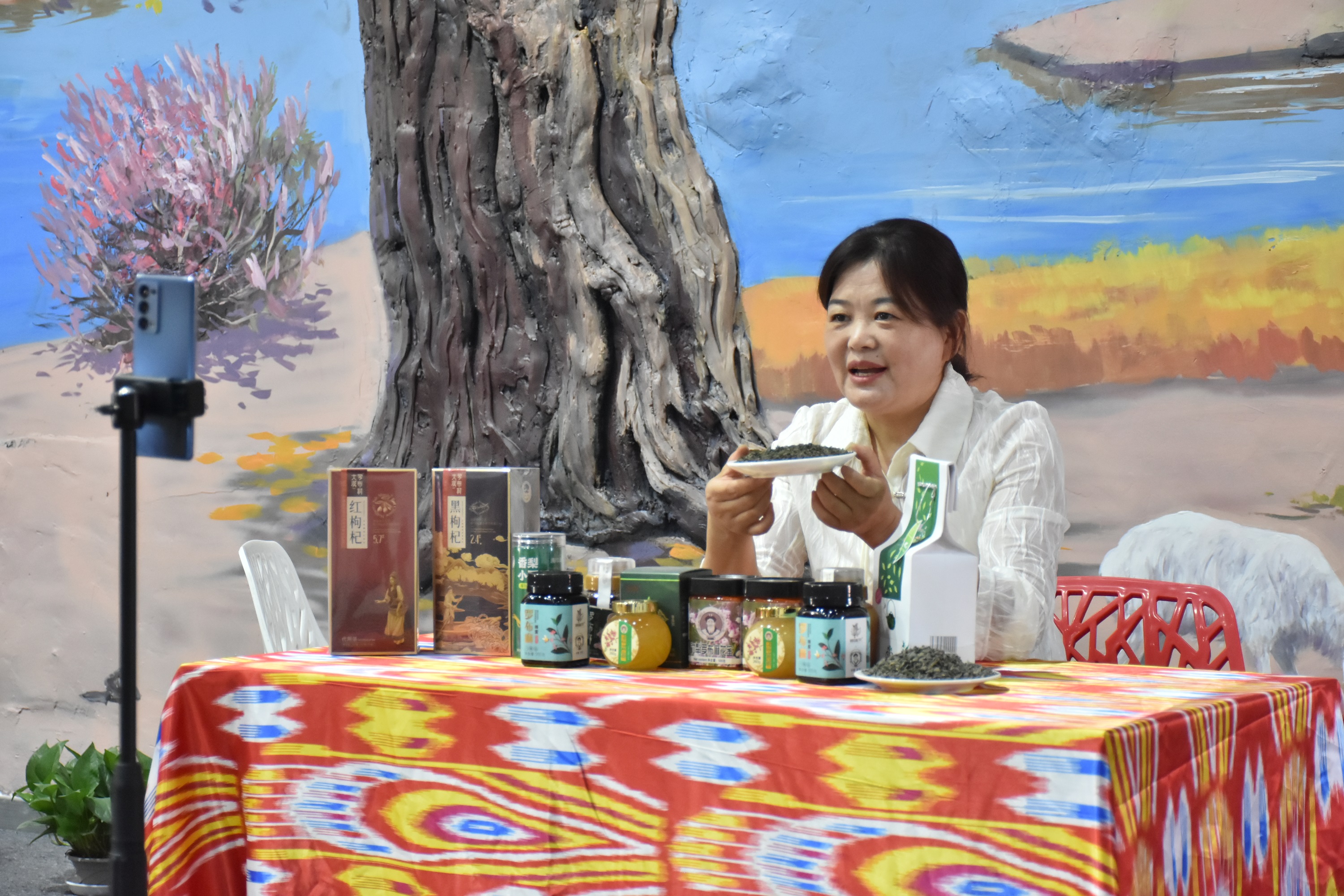 因?yàn)殡娚贪l(fā)展而受益的不只王曉紅。羅布麻茶、羅布麻蜜、尉犁小油馕、庫(kù)爾勒香梨、若羌紅棗、昆侖雪菊……走進(jìn)總面積近3000平方米的尉犁縣電商直播基地,100多種優(yōu)質(zhì)農(nóng)特產(chǎn)品整齊排列,不少主播正在直播。