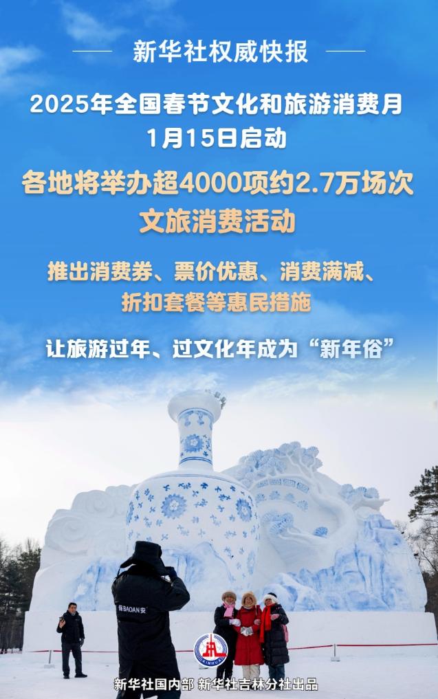 春節(jié)消費月期間,各地將結合冬季及春節(jié)文化和旅游消費特點,圍繞過年民俗、美食、冰雪、避寒、康養(yǎng)、親子、研學、演藝、時尚、國潮等重點消費需求,舉辦超4000項約2.7萬場次文旅消費活動,推出消費券、票價優(yōu)惠、消費滿減、折扣套餐等惠民措施,帶來實惠便利的文旅體驗,營造歡樂祥和的節(jié)日氛圍,讓旅游過年、過文化年成為“新年俗”,為人民群眾春節(jié)假期美好生活賦能添彩。