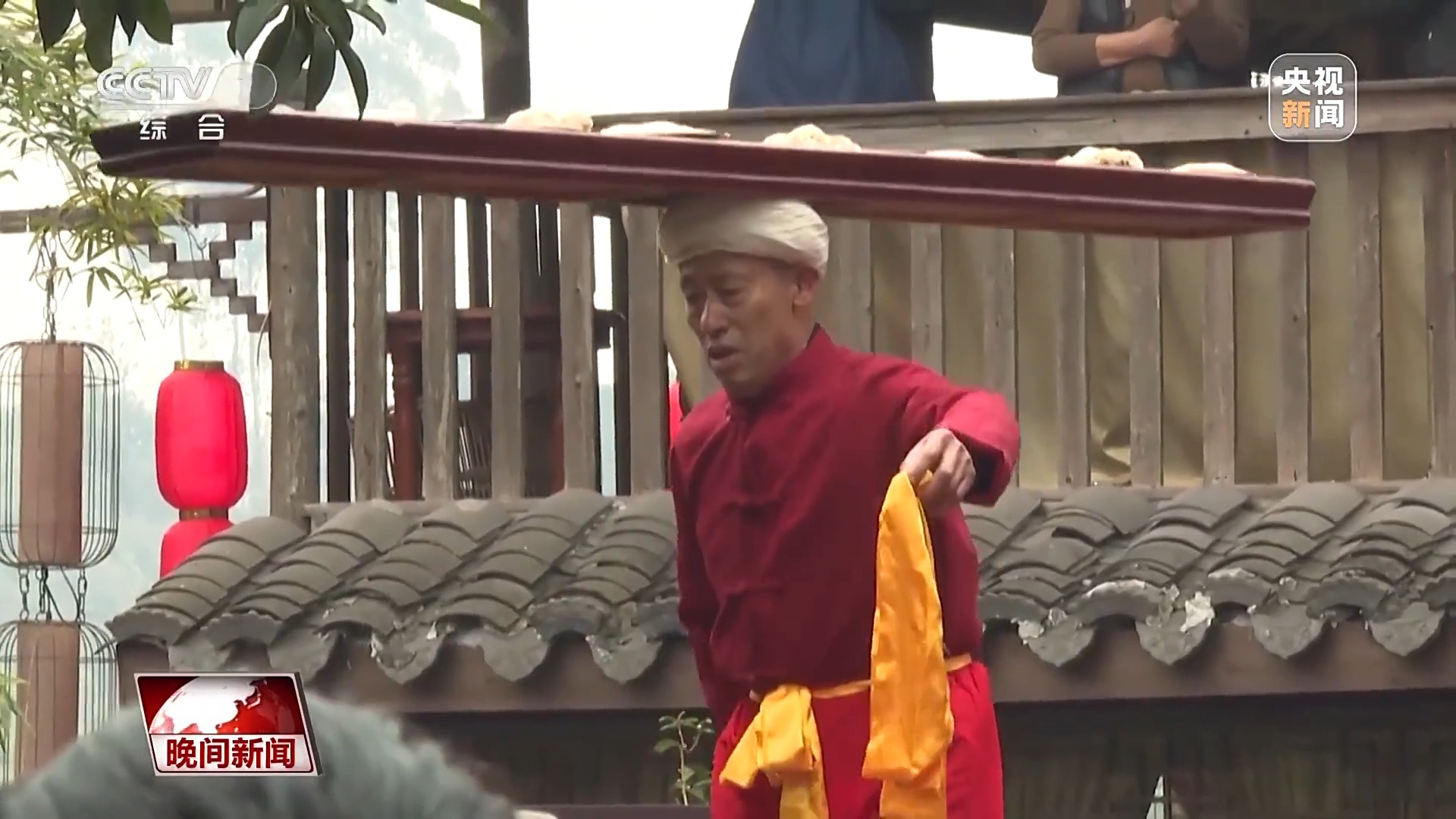 古鎮(zhèn)街道狹長(zhǎng),辦宴席時(shí)需要快速傳菜,于是便有了“打盆”這種獨(dú)特的上菜方式。在我們的左手邊,就有一位當(dāng)?shù)乩先苏诒硌荽蚺杞^技。