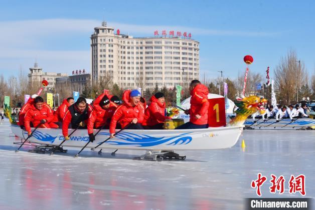 1月20日,內(nèi)蒙古盛世柳蘭代表隊(duì)代表中國參加錫林郭勒國際冰上龍舟錦標(biāo)賽。孫沐野攝