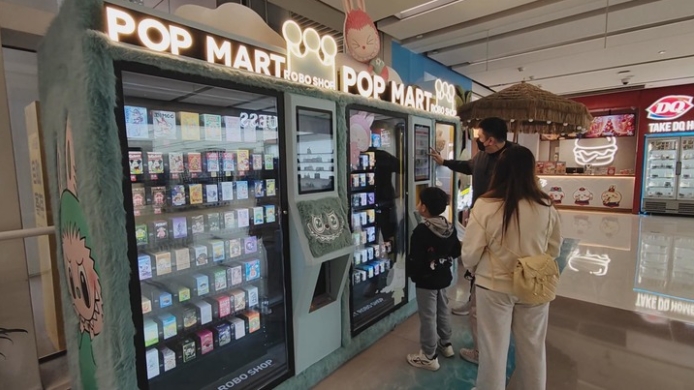 2025年1月,泰國游客在上海世茂廣場的一個泡泡瑪特自助售貨機前選購盲盒。新華社記者張夢潔 攝