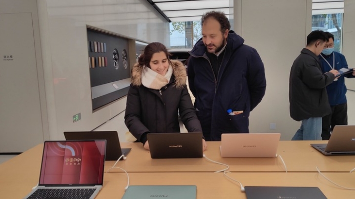 2025年1月,意大利游客戴維德在位于上海市南京路步行街的華為旗艦店參觀選購。新華社記者張夢潔 攝