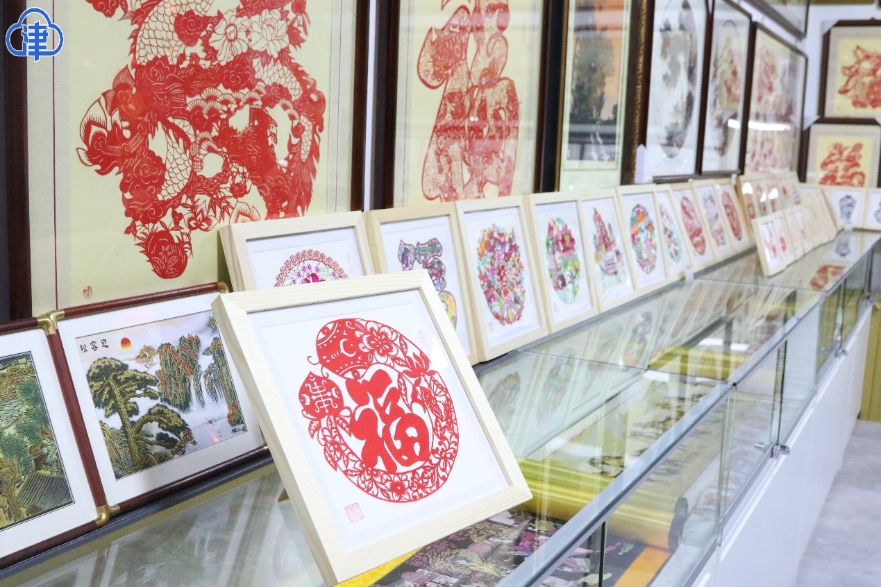 在戲樓對面,楊柳青剪紙世家第四代傳人,郝桂芬的剪紙鋪吸引了眾多游客的駐足。郝桂芬既是店鋪的“當(dāng)家人”,也是非遺剪紙項目的代表性傳承人。楊柳青剪紙的技法,既需要用北方剪刀剪出輪廓,又需要用南方刻刀雕飾細(xì)節(jié)。郝桂芬的獨(dú)門絕技——染色剪紙,是先用白紙剪出樣式,再用楊柳青年畫的技法上色。她的剪紙作品包括花鳥魚蟲、神話故事、喜慶吉祥圖案等,深受游客喜愛。在這里,游客們不僅可以購買到精美的剪紙作品,還能在學(xué)習(xí)體驗剪紙技法,感受指尖上的古老藝術(shù)。