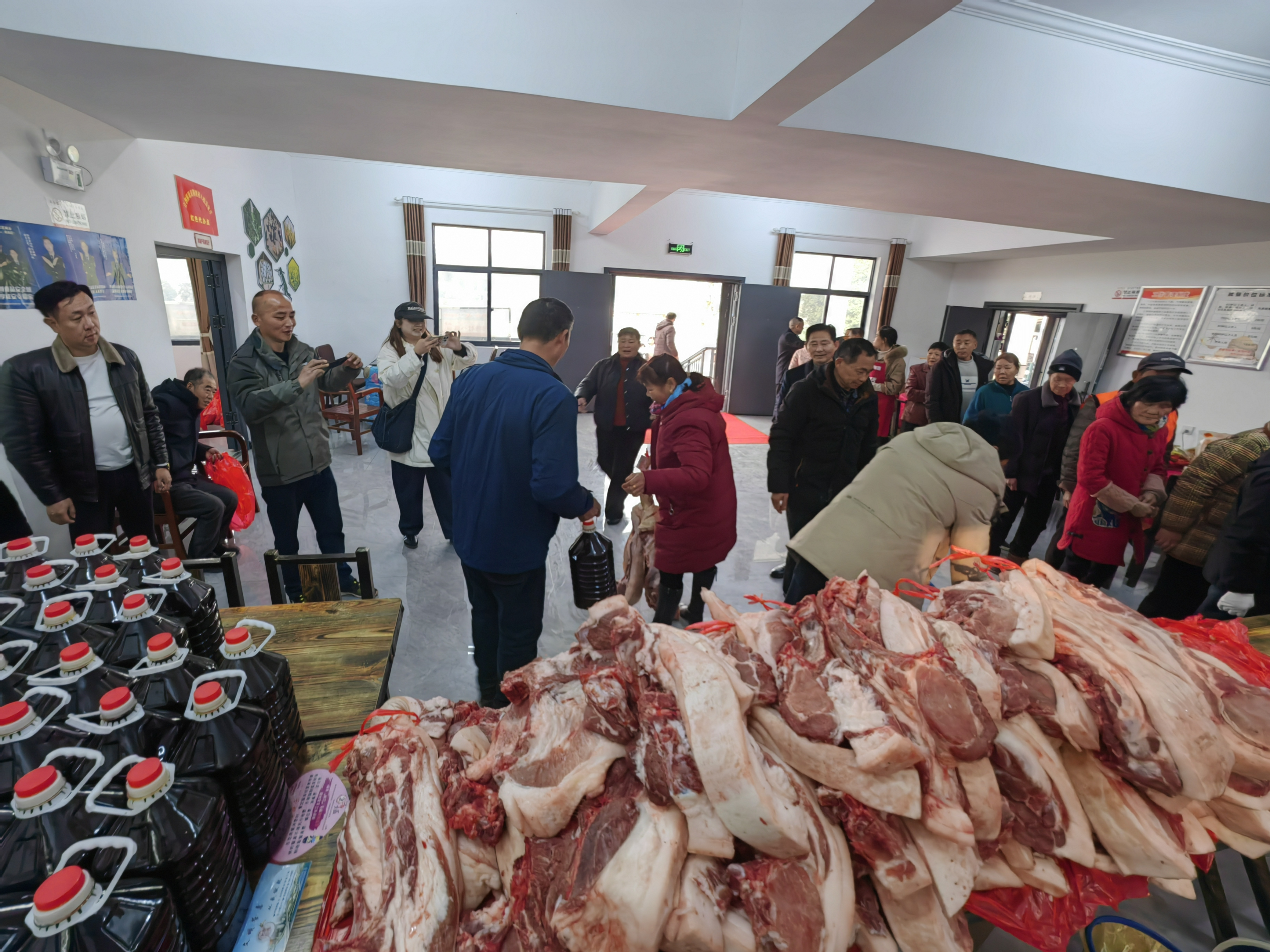 大廳里的長條桌上,一刀刀剁好的新鮮豬肉堆成小山,一袋袋自己種的生態(tài)米裝成包,一提提噴香的菜籽油擺放整齊,村民們早早排成長隊,開心地簽字領(lǐng)錢領(lǐng)米領(lǐng)肉?!罢媸菦]想到我能分到這么多紅利,我每周開車回來打掃衛(wèi)生,順便將社區(qū)朋友們訂的土雞和雞蛋帶回溫泉城區(qū)?!贝迕裢慷收f。