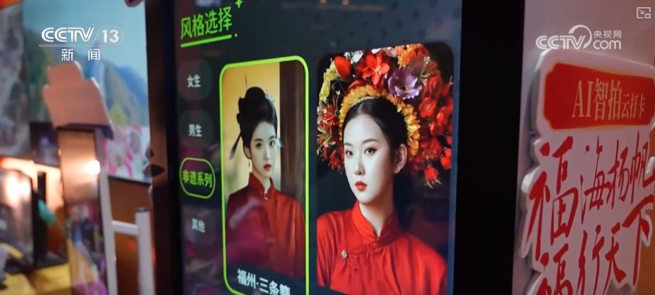 夜幕降臨,一場新春科技大秀在福州市的冶山春秋園上演了。泉州的簪花是福建文旅的頂流,在現(xiàn)場,一臺AI旅拍機吸引了許多游客排隊體驗。只要拍攝一張照片,就可以利用AI一鍵生成“簪花圍”造型,還能輕松在各種非遺裝扮之間來回切換。