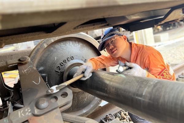 1時30分,作業(yè)人員攜帶道尺、檢查錘、油壺等材料工具,向站場西邊進發(fā),點點頭燈猶如點點螢光,緩緩向前方移動。10分鐘后,左自強抵達14號道岔,他彎下腰,將道尺卡在鋼軌間讀取數(shù)值?!?.5、0.4、0.5……”他邊檢查邊記錄,不放過一處問題隱患。在一顆松動螺栓處,左自強先用手旋緊,再用扳手緊固,最后雙手用力下壓扳手,直至螺栓紋絲不動?!耙活w螺栓松動,就可能帶來重大安全隱患。再細(xì)小的事情我們也要認(rèn)真仔細(xì)地做好?!弊笞詮娬f。