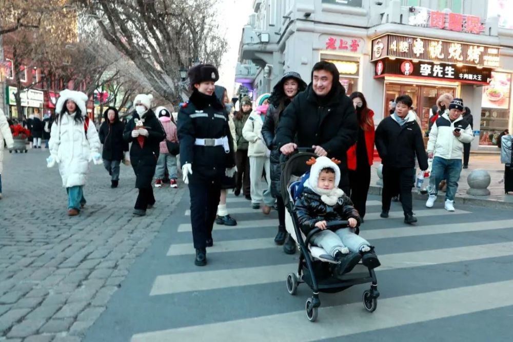 游客在哈爾濱冰雪大世界園區(qū)內(nèi)的冰建祈年殿旁邊游玩。