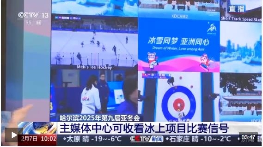 通過現(xiàn)場的大屏可以看到正在進行的比賽,大屏在賽時可提供所有冰上場館的9路信號,來自不同國家和地區(qū)的媒體記者可以根據(jù)自己的需求來選擇不同比賽場次信號來關(guān)注。