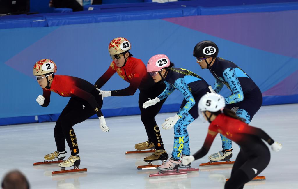 2月7日,中國(guó)隊(duì)選手范可新(左一)、林孝埈(左二)在比賽中交接棒。當(dāng)日,第九屆亞冬會(huì)短道速滑混合團(tuán)體2000米接力半決賽在哈爾濱舉行,中國(guó)隊(duì)晉級(jí)決賽。新華社記者 丁旭 攝