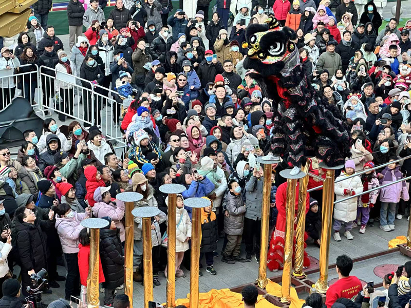 2月2日,在北京東岳廟廟會(huì),門(mén)前的北獅表演吸引眾多市民游客駐足觀看。一位家住附近的游客對(duì)記者表示:“過(guò)年期間這里的舞獅表演每天都不一樣,南獅北獅都有??吹谜孢^(guò)癮!”