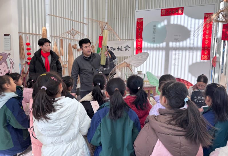 余杭紙傘非遺工坊主理人劉偉學(xué)向孩子們介紹傘骨的制作方法。(受訪者供圖)