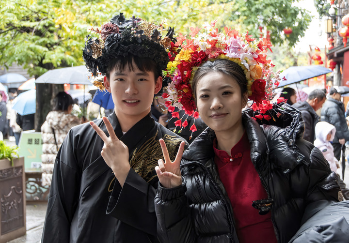 2月3日,在福州市千年古街三坊七巷,兩名來(lái)自上海的游客頭戴“簪花”打卡留影。新華社記者魏培全攝