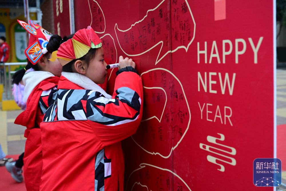 2月14日,在合肥市園上園小學(xué)喻崗分校,學(xué)生參加畫蛇添“福”活動。新華社記者 周牧 攝