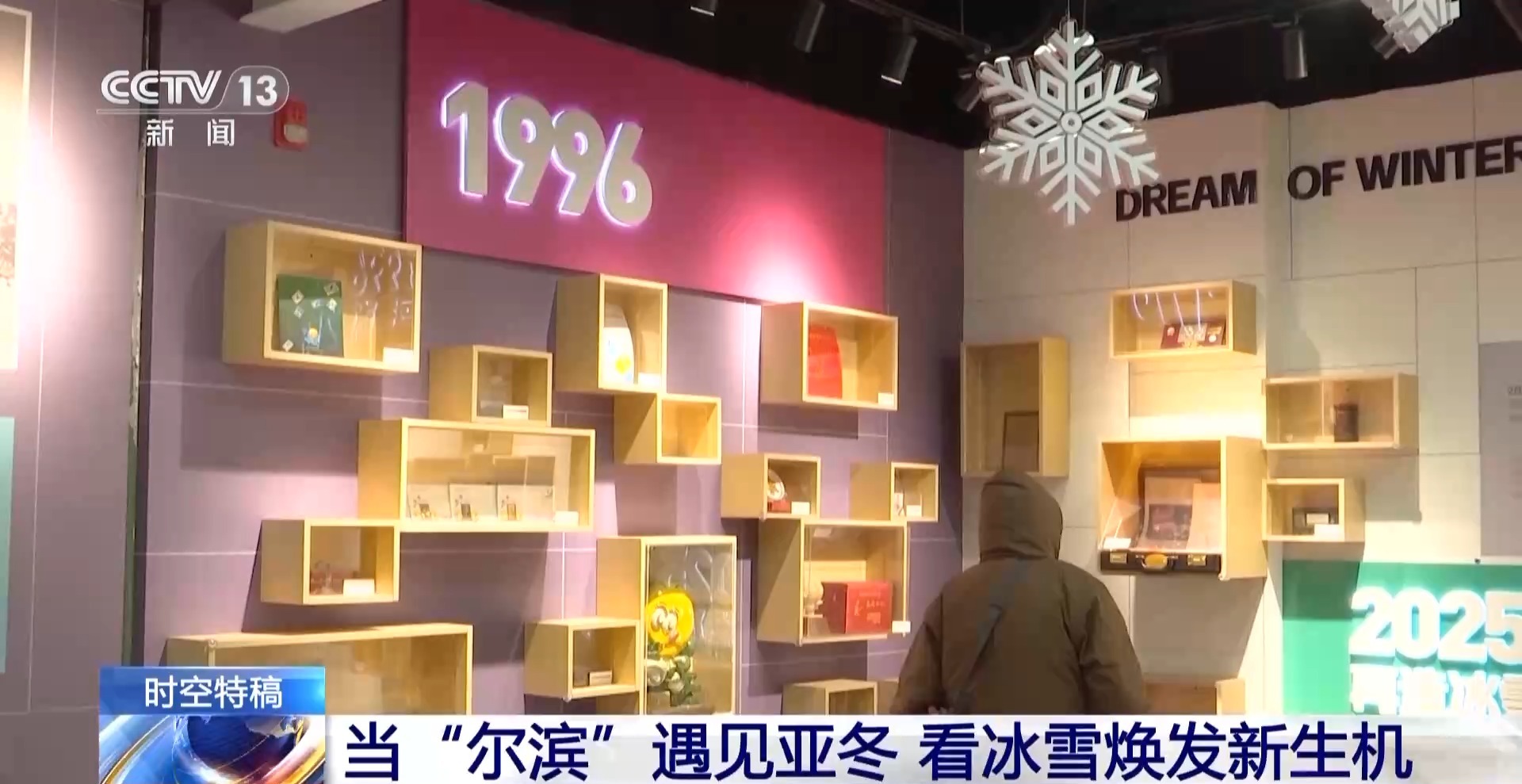 總臺央視記者 鄭怡哲:看完了亞布力的絕美雪景和熱鬧非凡的雪場,讓我們回到哈爾濱的市區(qū)來看一看。那要說什么地方最能體現(xiàn)黑龍江哈爾濱兩屆亞冬會城市這一端的變化,那一定是這個雙亞冬的紀念館,其實我覺得從紀念品上就能看出這個城市的特點和發(fā)展脈絡。