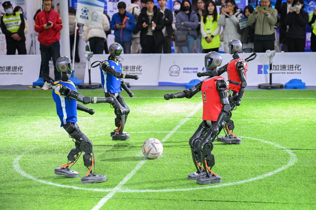 機器人踢足球。新華社記者 陳浩明 攝
