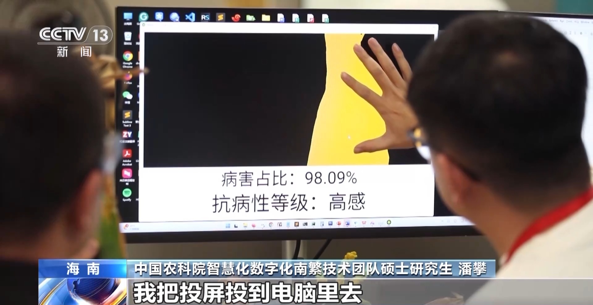 中國農(nóng)業(yè)科學院智慧化數(shù)字化南繁技術(shù)團隊碩士研究生 潘攀:這上面的黃色的部分,就是有病害的部分,這個綠色的部分是,相當于是沒有病害的部分。