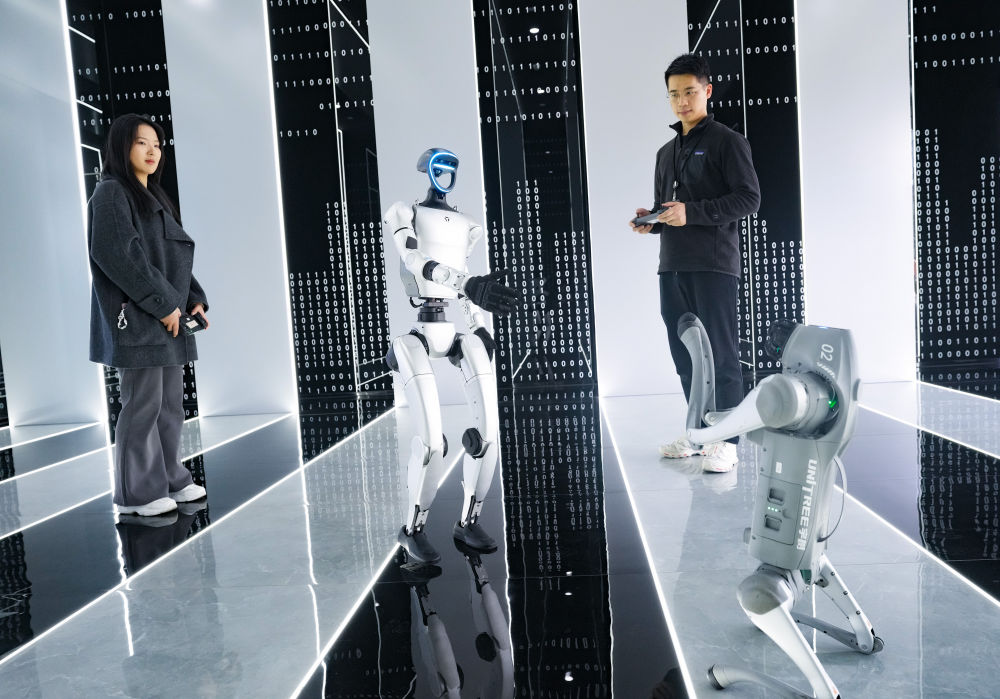 3月1日,在杭州宇樹科技有限公司的產(chǎn)品展示中心,人形機(jī)器人和四足機(jī)器人在工作人員控制下做動(dòng)作。新華社記者 翁忻旸 攝