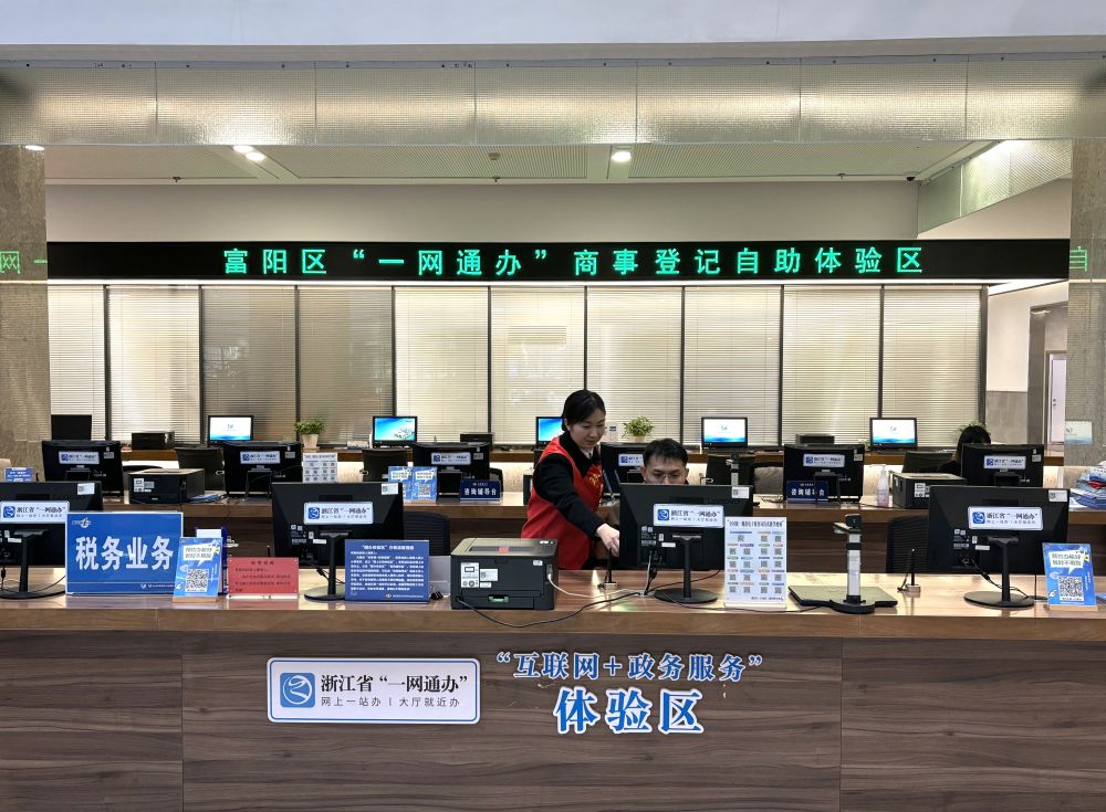 2月18日,在杭州市富陽區(qū)政務(wù)服務(wù)中心,工作人員引導(dǎo)群眾自助辦理“一網(wǎng)通辦”事項(xiàng)。(受訪單位供圖)