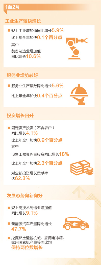 發(fā)展態(tài)勢向新向好,新動能快速成長、綠色產(chǎn)業(yè)蓬勃發(fā)展。1至2月,規(guī)模以上高技術(shù)制造業(yè)增加值同比增長9.1%,新能源汽車產(chǎn)量同比增長47.7%。