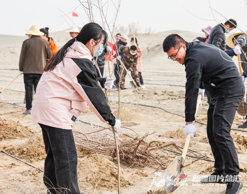 3月12日,在和田市現(xiàn)代農(nóng)業(yè)產(chǎn)業(yè)園區(qū)植樹點,干部職工相互配合植樹。許曉龍攝