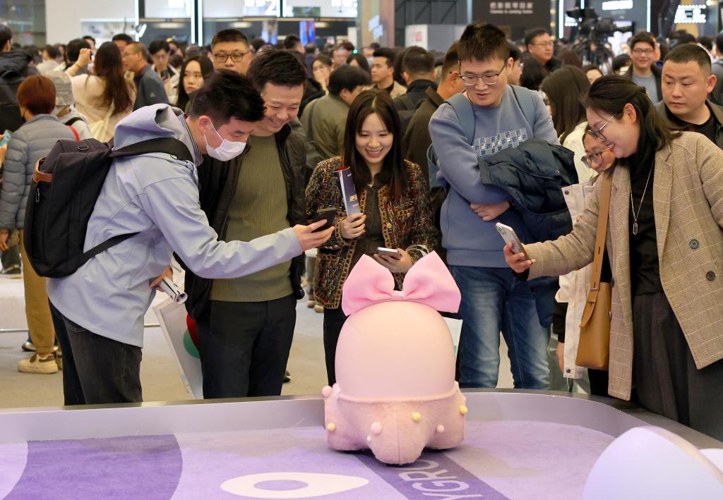 3月20日,參觀者在展會上與“Ai Me智能機(jī)器人”互動(dòng)。當(dāng)日,以“AI科技、AI生活”為主題的2025中國家電及消費(fèi)電子博覽會(AWE2025)在上海新國際博覽中心開幕。本屆展會吸引全球千余家企業(yè)參展,全景展示家電及消費(fèi)電子領(lǐng)域的前沿成果,呈現(xiàn)AI賦能智慧生活的新產(chǎn)品、新方案、新場景。(新華社記者 方喆 攝)