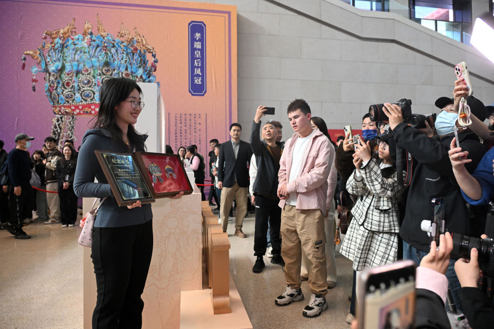 當日,國博文創(chuàng)團隊將“紀念款鳳冠冰箱貼”和紀念證書贈送給第100萬件鳳冠冰箱貼的購買者——來自山東東營的“95后”觀眾李雅菲。