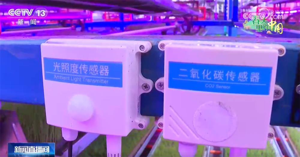 來到這個(gè)育秧車間,我們可以看到現(xiàn)在的秧苗都已經(jīng)坐上電梯了。在立體循環(huán)育秧架上,一盤盤綠油油的秧苗坐著升降梯輪流接受光照。架子上還裝有智能傳感器,把溫度、濕度等信息實(shí)時(shí)顯示在大屏上。同時(shí),還可以用手機(jī)進(jìn)行遠(yuǎn)程操控,根據(jù)秧苗長勢自動進(jìn)行補(bǔ)光、噴淋。