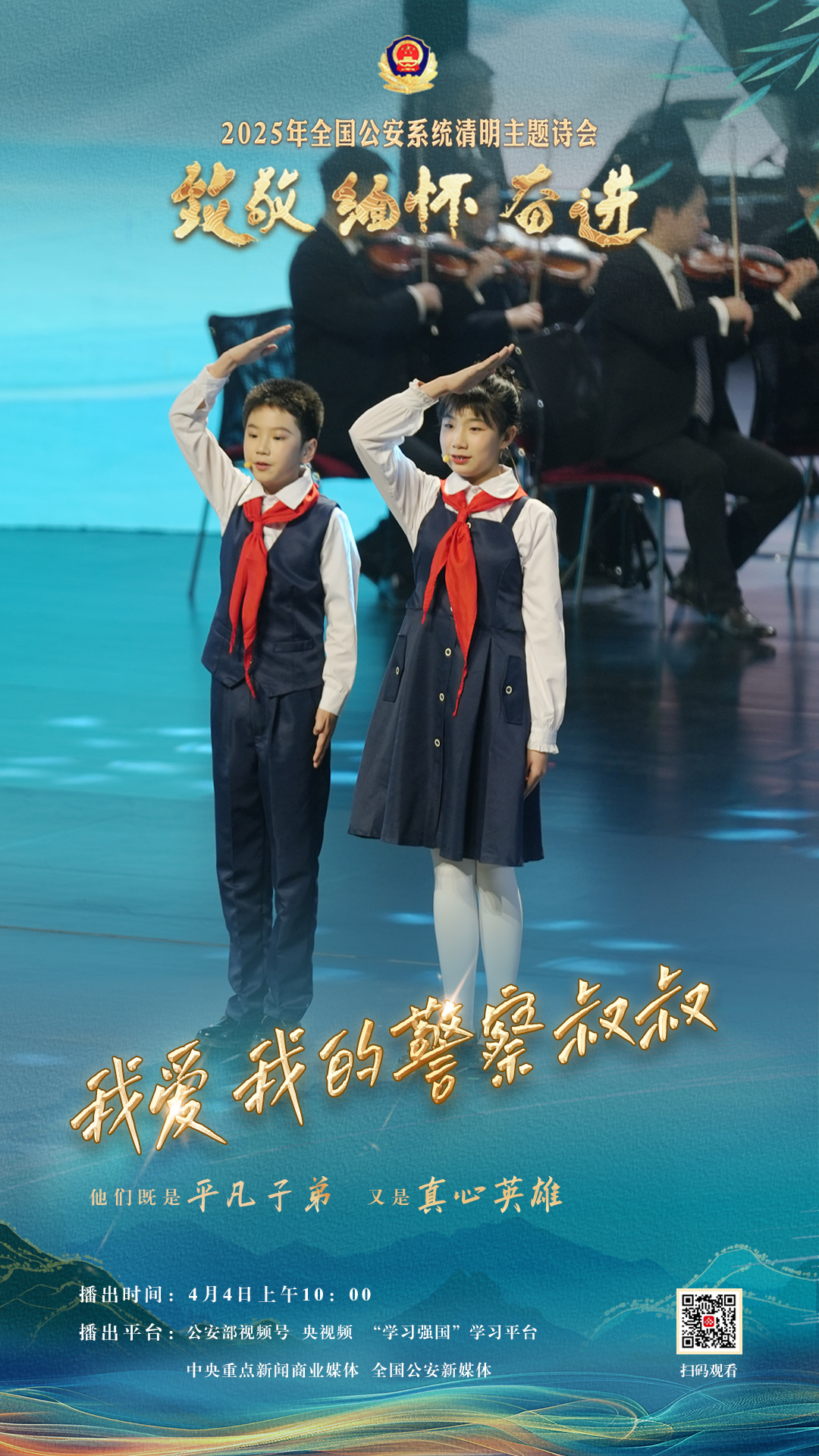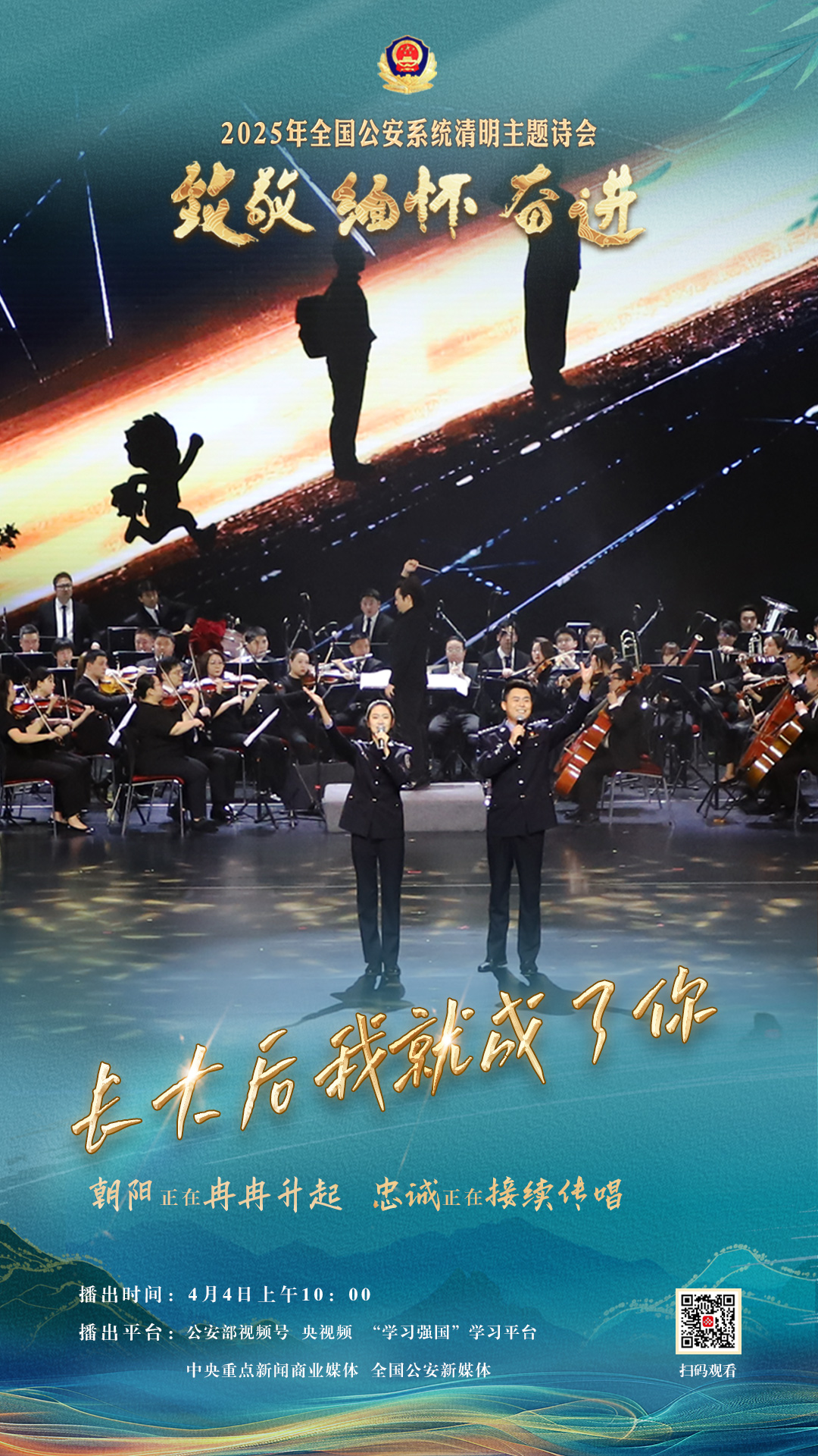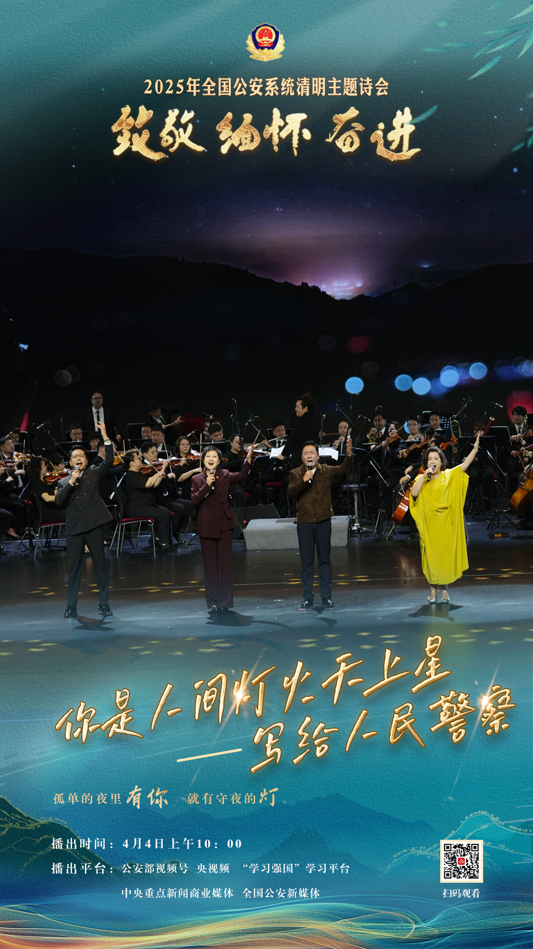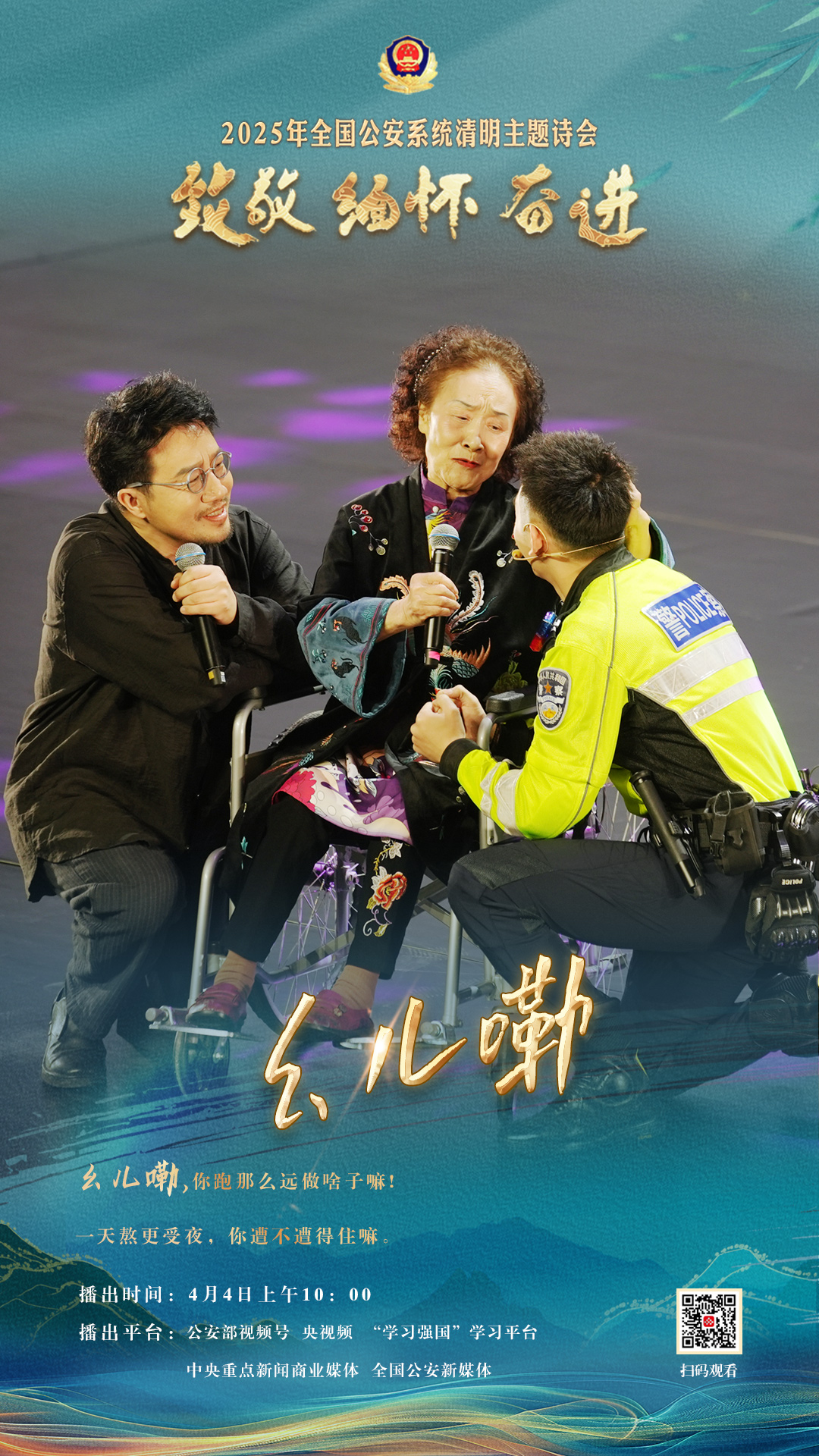 為充分展現(xiàn)全國(guó)公安機(jī)關(guān)和廣大公安民警、輔警時(shí)刻銘記習(xí)近平總書(shū)記的關(guān)心關(guān)懷,時(shí)刻為黨和人民而戰(zhàn)的忠誠(chéng)政治本色,深情追憶一年來(lái)公安系統(tǒng)涌現(xiàn)的英雄模范感人事跡,激勵(lì)引導(dǎo)廣大公安民警以更加奮發(fā)有為的精神面貌,堅(jiān)決履行好黨和人民賦予的神圣職責(zé)使命,今年清明節(jié)當(dāng)天,公安部新聞宣傳局、全國(guó)公安文聯(lián)、四川省公安廳聯(lián)合舉辦“致敬·緬懷·奮進(jìn)”2025年全國(guó)公安系統(tǒng)清明主題詩(shī)會(huì)。