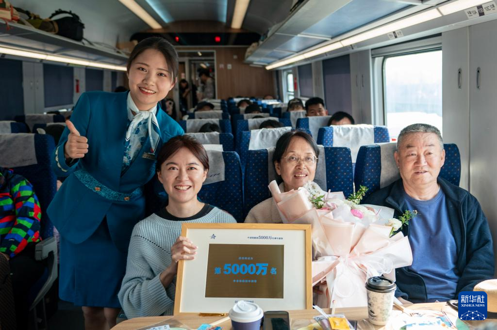 3月28日,中老鐵路第5000萬名旅客孫怡薇(前右三)與父母及乘務(wù)員在列車上合影留念。