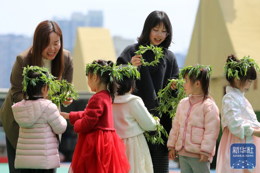 ↑ 4月2日,在山東省青島市李滄區(qū)青峰路幼兒園開(kāi)展的迎清明活動(dòng)中,老師指導(dǎo)小朋友編柳帽。新華社發(fā)(張鷹攝)