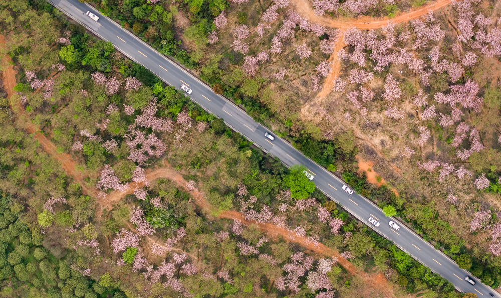 游客驅(qū)車前來清鎮(zhèn)市紅楓湖鎮(zhèn)右二村踏青游玩(4月5日攝,無人機(jī)照片)。新華社記者 陶亮 攝