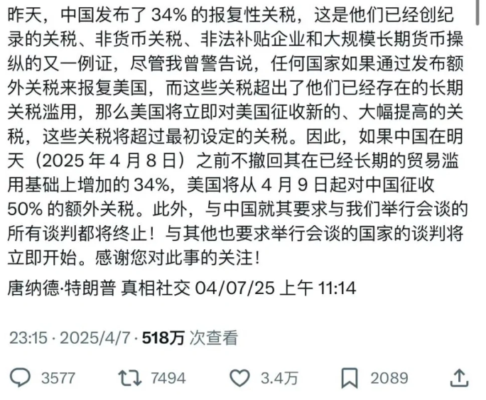 一覺(jué)醒來(lái),特朗普再發(fā)威脅,警告中國(guó)在4月8號(hào)前取消報(bào)復(fù),不然4月9號(hào)就對(duì)中國(guó)再加50%額外關(guān)稅,此外所有和中國(guó)的談判都會(huì)中止,而和其他國(guó)家的談判將立即開(kāi)始。