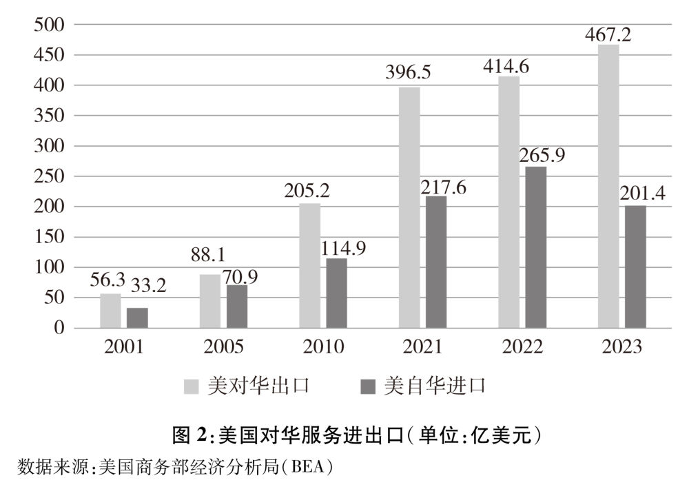 美國服務業(yè)產(chǎn)業(yè)門類齊全,具有較強國際競爭力。總體來看,隨著經(jīng)濟不斷發(fā)展和人民生活水平提升,中國對服務需求明顯擴大,中美雙方服務貿(mào)易快速增長。據(jù)美國商務部統(tǒng)計,2001-2023年,中美服務貿(mào)易額由89.5億美元擴大到668.6億美元,增長了6倍(圖2)。根據(jù)中方統(tǒng)計,2023年,美國是中國第二大服務貿(mào)易伙伴;據(jù)美方統(tǒng)計,中國是美國第五大服務出口目的地。