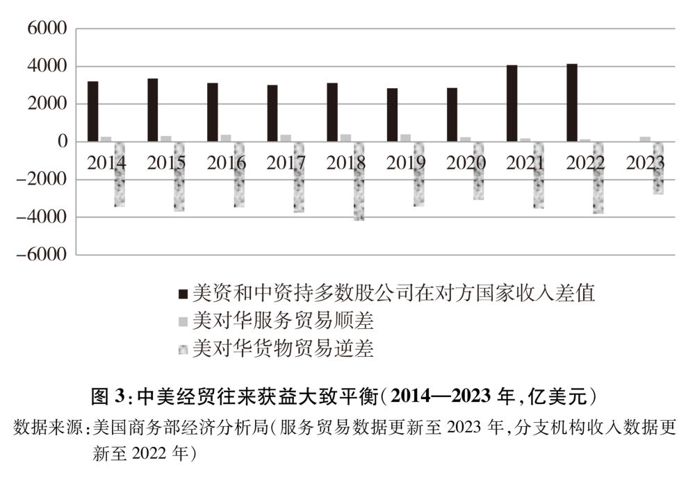 根據(jù)美國商務部數(shù)據(jù),2023年美國對華服務貿(mào)易順差為265.7億美元,美國在服務貿(mào)易方面占有顯著優(yōu)勢;2022年美資企業(yè)在華銷售額高達4905.2億美元,遠高于中資企業(yè)在美786.4億美元的銷售額,差額高達4118.8億美元,美國企業(yè)跨國經(jīng)營優(yōu)勢更為突出。