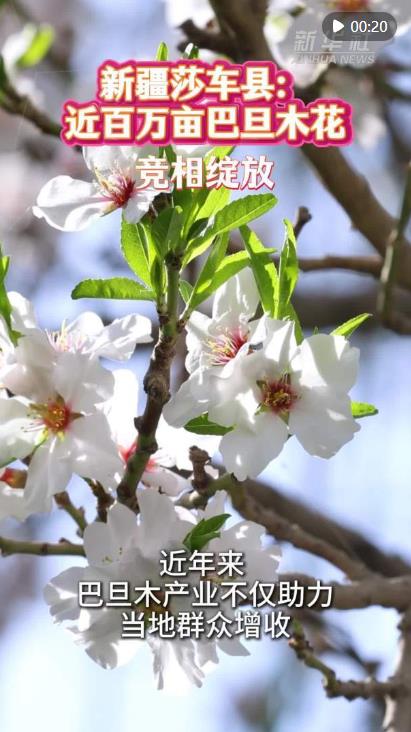 眼下,新疆莎車縣近百萬(wàn)畝巴旦木花競(jìng)相綻放,粉白色花朵綿延成畫,芬芳隨風(fēng)飄蕩。
