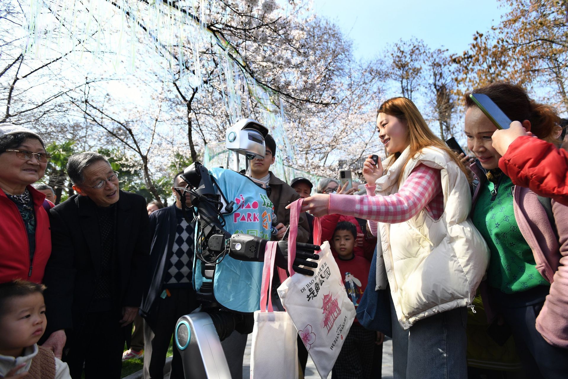 3月16日,武漢大學(xué)櫻花大道上,一臺(tái)身著黑色馬甲的人形機(jī)器人“智警小珞”穿梭在賞櫻人群中。