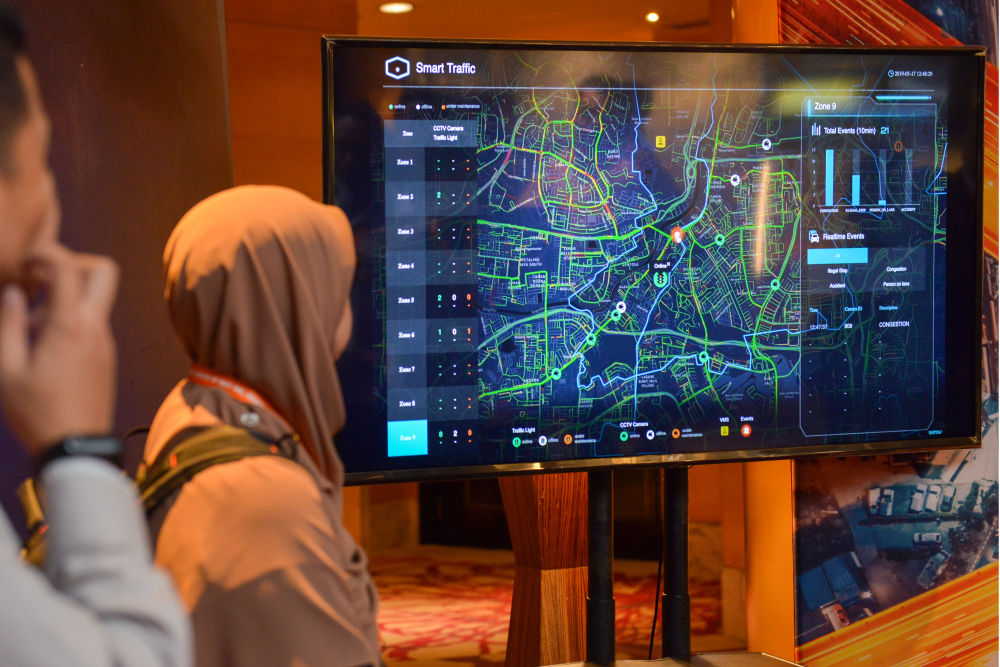 2019年,中國(guó)阿里巴巴集團(tuán)旗下云計(jì)算及人工智能科技公司阿里云宣布與馬來(lái)西亞智能交通公司“塞納交通系統(tǒng)”合作,在馬來(lái)西亞共同打造智能交通管理系統(tǒng)。這是2019年5月23日在吉隆坡拍攝的智能交通管理系統(tǒng)演示現(xiàn)場(chǎng)。